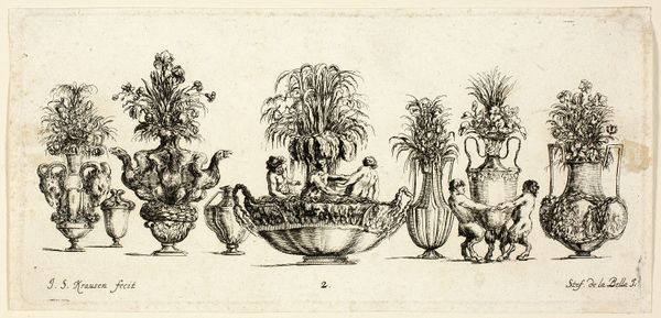 Stefano della Bella created this etching, "Six vases, and two sketches of vases," capturing the ornate designs popular in the 17th century. The vases, adorned with figures and foliage, speak to a fascination with classical forms and the natural world. Notice the recurring motif of the human figure integrated into the vase design. These small sculptures, intertwined with foliage, echo the ancient Greek and Roman tradition of incorporating human forms into architecture and decorative arts. Consider the caryatids of the Erechtheion, where female figures support the temple roof: Della Bella's vases similarly blend human and structural elements, hinting at a deeper, perhaps subconscious, desire to imbue objects with life and animation. The vase itself, from ancient amphorae to Renaissance urns, has always been a symbol of containment, of holding both the sacred and the profane. Della Bella's vases, brimming with life, become powerful symbols of transformation, reflecting our enduring connection to the past, continuously reshaping itself through time.