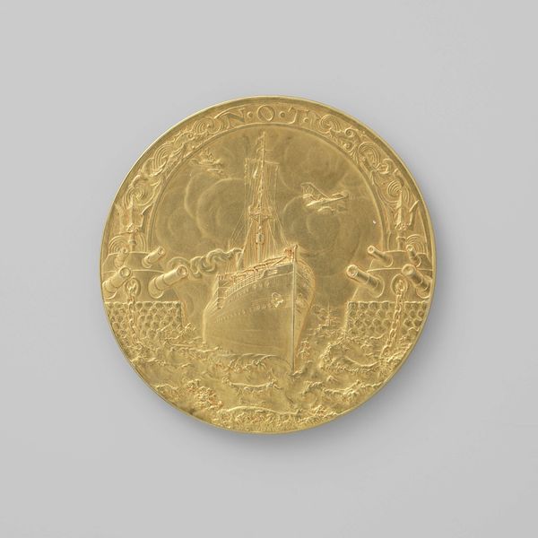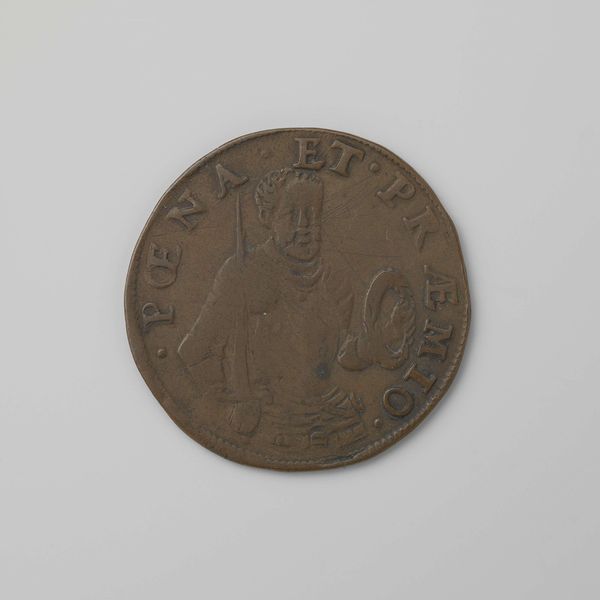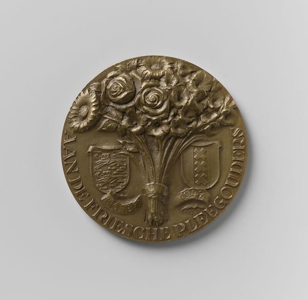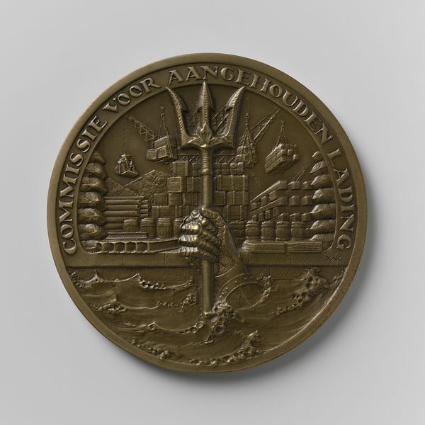 This bronze prize medal was made in 1912 by the Koninklijke Utrechtsche Fabriek van Zilverwerken van C.J. Begeer, probably using a stamping process. It's interesting to consider the object in terms of mark-making, even though it's not painting. The hand clutching the torch is so crisply rendered, especially in contrast to the background details of scaffolding and architectural structures. The buildings are almost smudged, whereas the hand and the flame feel incredibly present. The patina of the bronze gives it a tactile warmth. I want to touch it! The way the light catches the high points of the design, makes you think about what it means to hold something, to reach for an ideal. Maybe that's the torch, maybe it's the medal itself. It reminds me a little of the work of Jan Toorop, another Dutch artist working at the turn of the century, who was interested in the way that simple forms could carry complex meanings. The medal becomes a symbol, but of what? It's up to you to decide.