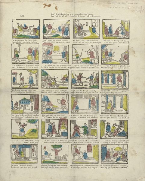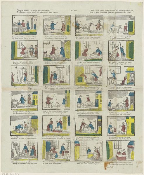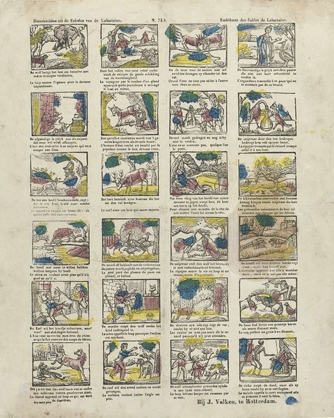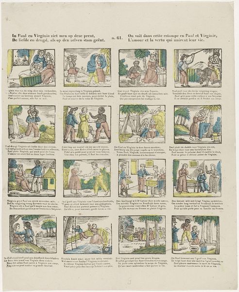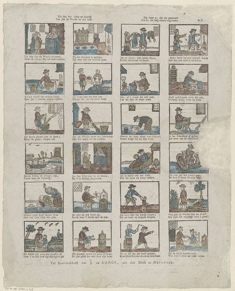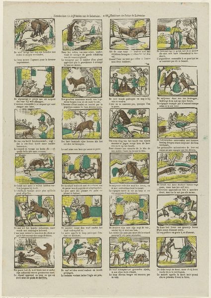 Curator: This intriguing piece, attributed to Franciscus Antonius Beersmans and dating from 1866 to 1902, is titled "Gepaste boerterij mag u, o jengd, vermaken…," a comic strip composed of engravings. What stands out to you? Editor: Visually, the sequential layout is immediately compelling. It seems to be aiming for a simplistic aesthetic, yet there's a disjointed feel. Each frame feels isolated. The figures are somewhat stiff. It brings to mind the formalist concerns of narrative structure and composition, and raises some initial questions. Curator: Indeed. The structural arrangement—the grid-like format—echoes early forms of visual storytelling, much like the moralizing broadsides circulating at the time. And the application of colour in selected spots to the otherwise black-and-white image—yellow for example—serves an expressive as well as structuring role here. The accompanying Dutch and French verses reinforce the narratives—guiding viewers to interpret the comic's moral compass, don’t you think? Editor: Precisely, and here’s where historical context becomes invaluable. Beersmans appears to employ images to construct the notion of proper behaviour and virtue for youngsters and it’s fascinating to see what is included and omitted within a society, its norms, and expectations of that time. This, undoubtedly, had a strong didactic agenda and operated under the auspices of social and political norms prevalent in that moment. The limited colour palette too has potential. The symbolic intention needs more exploration to determine a possible purpose. Curator: I see your point. From a formal perspective, this coordinated, if rudimentary, palette adds layers and pulls disparate vignettes together. Its execution reflects its likely status as popular imagery intended for mass consumption; the engravings allow efficient reproduction to facilitate widespread distribution. What about those choices and limitations appeals to its audience? Editor: A critical viewpoint unveils further complexity in the matter. Are the social regulations genuinely being bolstered or possibly subtly resisted or ironically observed? The comic framework allowed a form of expression. The relationship between image, verse, intent, and reception at that specific historical juncture is something to explore. Curator: I concede. This opens fresh avenues for viewing and engaging the work. My gaze has definitely broadened to embrace deeper understandings beyond technique and raw visual appeal alone. Editor: Likewise, observing the structural elements reminds us of the framework for meaning that shapes both our view of the work and its original purpose.