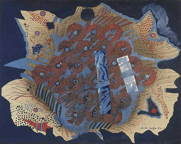 Editor: Here we have Okiie Hashimoto's "Sand Garden, Konchi-in" from the Harvard Art Museums. It's a beautiful print; the contrast of the rigid geometric shapes against the swirling lines of the 'sand' is striking. What do you see in this piece? Curator: The artist uses geometric forms against a flowing background to create a dialogue between order and chaos. Notice how the squares are not perfectly aligned. Does this imperfection speak to a more organic process, challenging the rigid geometry? Editor: That's interesting. The imperfect alignment does add a sense of naturalness despite the geometric shapes. I never would have noticed that. Curator: Precisely. And consider how the materiality of the printmaking process itself contributes to this effect. The texture of the woodblock adds another layer. It's a testament to the artist's control and vision. Editor: This piece really makes you think about the relationship between the natural and the artificial. Curator: Indeed. A fascinating study in contrasts.