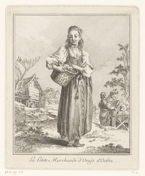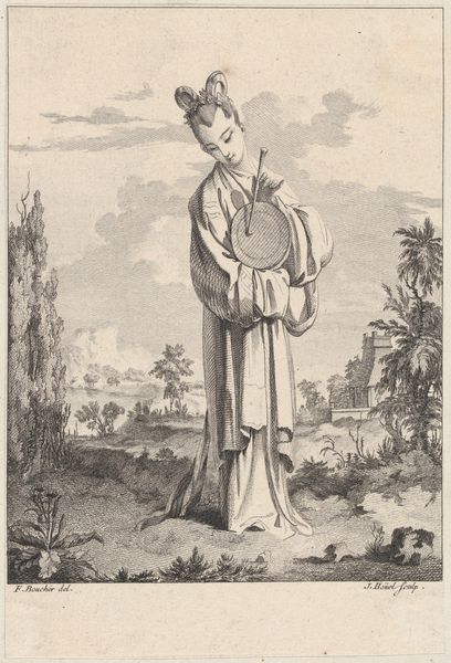 Editor: This is Jean-Pierre-Louis-Laurent Hoüel's etching, "Chinoiserie with a woman holding cymbals," made sometime between 1755 and 1776. The figure's ornate costume stands in stark contrast to the relative simplicity of the landscape around her. How do you interpret the blending of these cultural symbols? Curator: It’s a fascinating pastiche. Consider what “chinoiserie” truly means—a European interpretation of Chinese aesthetics. The woman with her cymbals isn’t just a figure, but a symbol representing Europe’s imaginative, often distorted, view of the East. Notice how the architectural elements in the landscape aren’t distinctly Chinese either; there's a blending of familiar European structures alongside vaguely “Eastern” motifs. It creates a space where cultural boundaries blur. What does that ambiguity evoke for you? Editor: I see the blurring, but I am unsure of its purpose. Is this reverence, misunderstanding, or something else? Curator: Perhaps it's all of those things coexisting. The Rococo period was defined by such ornamentation, celebrating opulence and fantasy. "Chinoiserie" becomes another form of escapism. By imbuing Chinese motifs, they aren't documenting or truly understanding China; instead, they are appropriating it, constructing their own fantasy that perhaps reveals more about themselves than the culture they are representing. Editor: So, the symbolism reflects the European worldview, using Chinese elements as building blocks for something new and imaginative. That's a powerful insight. Curator: Indeed. By understanding the symbolic language employed here, we understand a chapter of Europe's dialogue with a world beyond its borders, even in its misconceptions and idealizations. Editor: I will definitely remember this artwork through the lens of cultural symbolism and the complex power dynamics at play. Thank you!