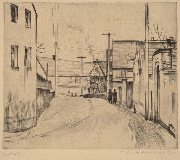 Curator: This is Albert Gottschalk's "En fransk gade," or "A French Street," created in 1903. It's a pencil drawing, quite a departure from traditional painting of the period. Editor: Yes, the medium stands out! I am also drawn to the everydayness of the street, depicted in a rather raw, almost unfinished way. What do you make of it? Curator: Precisely! What intrigues me is the intentionality behind Gottschalk’s choice to render a mundane urban scene with such a simple tool and style. Instead of elevating through grand scale or color, the focus shifts to the means of representation itself. The visible pencil strokes remind us of the artist's labor and the material process. How does the location add to your interpretation? Editor: Being "a French street", as opposed to specifying which one, suggests this could be any ordinary street. Was Gottschalk interested in highlighting the anonymity and labor of everyday life? Curator: A key consideration is the rising industrialization of urban spaces at the turn of the century. Pencil drawings became rapidly reproducible. It also reflects the democratization of art, by showcasing accessible materials. What does that imply for the art market? Editor: So, Gottschalk might be subverting the art market by focusing on the everyday and utilizing reproducible techniques? It shifts the value from the preciousness of the object to the act of seeing and recording. Curator: Exactly. He draws attention to the often-overlooked infrastructure and daily routines that form the foundation of modern society, a departure from romanticized landscapes and portraiture. This focus transforms our appreciation to the worker that keeps this industry in operation, both Gottschalk’s act of representing and what his work actually depicts. Any last thoughts? Editor: This changed my perspective! The choice of pencil makes sense when we consider his subject matter: daily work and social environments. Curator: Mine too! Considering the social context in art is such a privilege and makes this drawing far from ordinary.