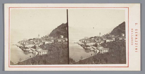 Editor: This photograph, "Boulevard van Bellagio aan het Comomeer" by Francis Frith, likely taken between 1859 and 1898, shows a cityscape along the shores of Lake Como. The print has a dreamlike, almost ethereal quality. How do you interpret this work? Curator: Immediately, the tower stands out as a key symbolic element. Towers have, across centuries, acted as beacons of civic power, religious authority, and, crucially, aspiration. Notice how it pierces the horizon, acting almost as a visual anchor to this burgeoning resort town. Editor: So, you're suggesting that the tower serves more than just a practical or aesthetic purpose? Curator: Precisely. The placement, almost centrally within the composition, imbues it with symbolic weight. The hazy quality that you pointed out furthers a sense of timelessness. Do you think it projects that into the city too? Editor: Perhaps it evokes a kind of nostalgia, idealizing a moment in time. The photograph itself is a record, but the softness almost suggests a fading memory. Curator: I would also point to the implicit contrast here. Note the 'natural' landscape of lake and mountain sloping into what humans have constructed: dwellings, boulevard. And there, in the foreground, we glimpse figures quietly inhabiting it. How does that impact the photograph, do you think? Editor: That’s really interesting to think about – it feels like this image is speaking to the impact we’re having on our surroundings, and that liminal space between nature and city. Thank you, I really appreciate the new perspective! Curator: And thank you, it's fascinating how different viewers bring their own associations to light.