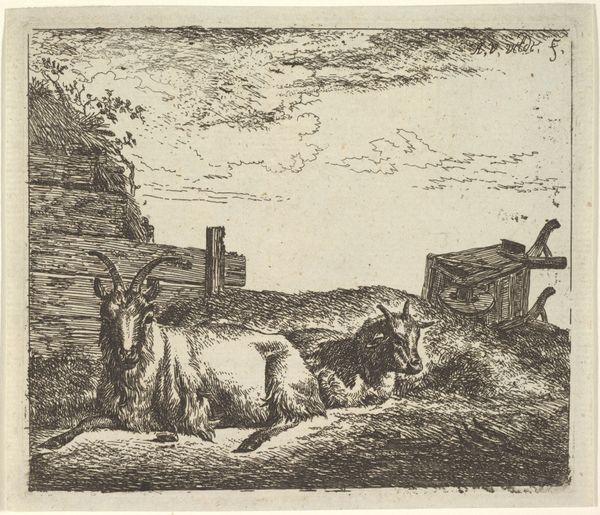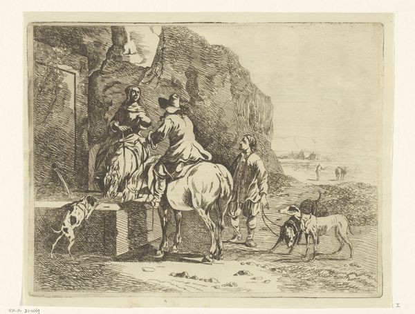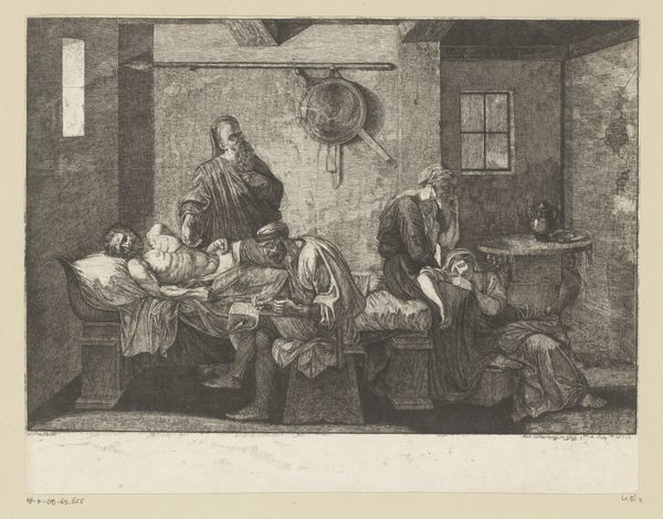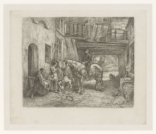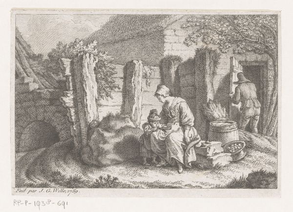 This print, Barmhartige Samaritaan, was created by baron Dominique Vivant Denon. Notice how Denon uses a dense network of etched lines to build form and space. The tonal range is narrow, yet the artist masterfully creates depth through varying the density and direction of these lines. This technique not only defines the figures and architectural elements, but also evokes a sense of dramatic chiaroscuro, highlighting the key narrative elements of the scene. The composition divides the scene into distinct zones – the shadowy foreground with the Samaritan tending to the injured man, the middle ground with onlookers and animals, and a distant landscape glimpsed through an opening. This structured arrangement encourages us to read the image as a sequence of actions unfolding in space and time. Denon's technical skill and visual construction elevates a religious parable into a meditation on human compassion, emphasizing the interplay between light and shadow, and the power of line to convey both form and emotion.