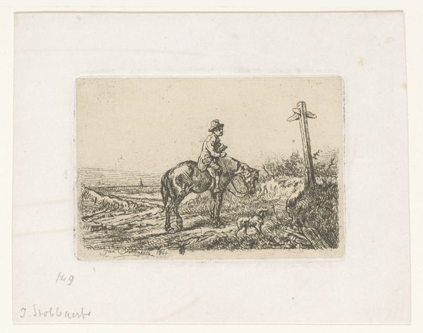 Editor: So, this is Joost van Geel’s “Postman Riding Along the Beach,” an etching from after 1666. It’s a busy scene, but something about the lone rider contrasts sharply with the cluster of figures in the background, lending it a somewhat melancholic mood. What strikes you most when you look at this piece? Curator: It's the visual vocabulary of transition that captivates me. The lone rider with his flag, positioned between the sea, symbolizing the unknown, and the village, a representation of societal order. Ask yourself, what message is he carrying? The flag becomes a symbol, laden with the hopes, anxieties, and communal memory of the time. Editor: That's fascinating. So, you see the postman as more than just a messenger? Curator: Precisely! Consider the psychological weight he bears. He’s not just delivering letters; he’s a connector, a carrier of stories that shape our understanding of the world. Look at how van Geel places him, almost silhouetted against the open sky. The engraving style, reminiscent of old maps, further underscores this idea of navigating the human landscape. Editor: I hadn't thought about the "map" aspect, but now I see how the details - the ships, the clustered houses - act like familiar markers. Does that imply something about Dutch identity? Curator: Absolutely! The sea was integral to Dutch life, offering both opportunity and threat. The postman, straddling land and sea, embodies the spirit of Dutch resilience and their constant negotiation with their environment. Note the clouds roiling above, and you begin to consider that his ride may be perilous as well. Editor: I’m now viewing the clouds as something beyond atmospheric conditions. I came into this thinking about one figure versus the group, and am now focused on the emotional and symbolic weight it bears as well! Curator: Indeed! A single image, a rich tapestry woven with the threads of culture, psychology, and history. We’ve taken the first steps together toward decoding that tapestry.