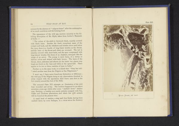 Curator: Let's delve into this "Fotoreproductie van een tekening van de jacht op een tijger," dated before 1880, and credited to Nicholas & Co. It appears to be a photomechanical print of a drawing, potentially even an etching. What strikes you about it? Editor: Initially, I’m drawn to the contrast, or maybe lack of, which renders it looking murky or mysterious. And the frenetic energy in the thicket makes it seem like things are not settled at all. How would you describe the scene compositionally? Curator: Observe how the composition relies on a strategic layering of light and shadow. The artist uses chiaroscuro, albeit subtly, to define form and depth. Note the absence of stark color, encouraging us to consider tonal relationships – the strategic arrangement of light and dark. These visual cues work to activate a sort of psychological anticipation. Does this observation resonate with your initial assessment? Editor: Absolutely. The emphasis on form through light and shadow adds an intriguing layer. You perceive a strategic arrangement—a sense of control and manipulation. Does the texture, which is, seemingly random due to etching, somehow feed into a larger structure of artistic purpose? Curator: The texture, seemingly random as you note, is an inherent property resulting from the artist's deliberate engagement with materials, informing the tactile and optical qualities that contribute significantly to its impact. Think about this in terms of the larger work… does the density help create visual weight, maybe drawing attention to the focus, if there is one? Editor: So, it’s the intrinsic qualities that ultimately shape how we perceive its energy and form. Thank you, I now see the piece as more organized. Curator: And I recognize its perceived chaos serves to evoke an important emotional response within us as observers.