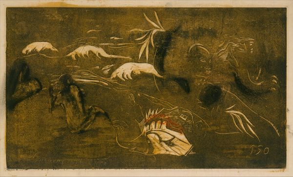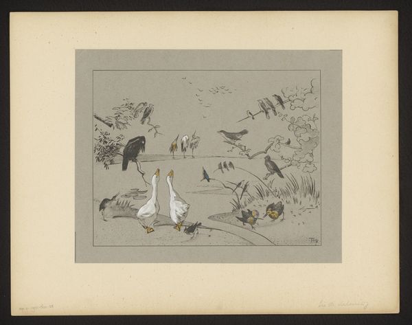 Charlotte Angus made this "Wall Paper" using gouache and graphite, and what's striking is the approach to mark making. It feels deliberate, like a puzzle coming together. The color palette is warm, grounded – browns and tans with unexpected pops of pink. It reminds me of the kind of color combinations you'd find in old, slightly faded photographs. There’s a tension between flat decorative pattern and an attempt to depict depth. Look at the textures, how the gouache sits on the surface, creating little ridges. I can almost imagine the artist dabbing and layering, building up the scene. Take the group of ducks taking off from the bank in the lower left corner. The pink used to depict them is so unexpected, but it somehow works, creating a focal point amidst the earth tones. It’s this kind of playful decision-making that makes art so engaging, isn't it? Like those works of Bonnard, a synthesis of observation and formal invention. Ultimately, art is about embracing ambiguity and multiple interpretations, which Angus achieves beautifully here.