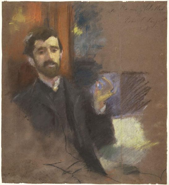 Editor: Here we have John Singer Sargent’s *Self-Portrait* from 1886, rendered in oil paint. I'm struck by the directness of his gaze and the almost unfinished quality of the edges. What can you tell me about this painting, especially regarding the time in which Sargent painted it? Curator: This *Self-Portrait* offers us a fascinating glimpse into the construction of artistic identity at a pivotal moment. Sargent was navigating the art world of the late 19th century, a world grappling with tradition and radical change. He seems to deliberately position himself outside traditional academic circles through the painting’s apparent nonchalance. Editor: How so? It still feels somewhat formal. Curator: Notice the tension. The dark suit and crisp collar suggest bourgeois respectability, yet the loose brushwork hints at Impressionistic experimentation and places him amongst the artistic avant-garde of the time. Consider how portraiture, historically a domain of the elite, becomes democratized through artists painting themselves, thereby questioning established hierarchies within the art world. Do you see the implied narrative Sargent is building through this contrast? Editor: I think so. He's showcasing both his skill and his rejection of rigid artistic conventions at once, declaring that he can go beyond traditional expectations, or that he chooses not to restrict himself with arbitrary rules. It is about the freedom he acquired through the acknowledgement of one's artistic position within an oppressive power structure. Curator: Exactly. This wasn't simply about self-representation. Sargent presents an interrogation of his role and the artist's evolving social position, reflecting the changing dynamics of class, taste, and artistic expression. Editor: This reframes my entire view of this painting. I’d initially seen it as a simple portrait, but now I recognize it as a statement on Sargent’s negotiation of identity within the cultural and artistic landscapes of his time. Curator: Precisely! And that's the power of looking beyond the surface.