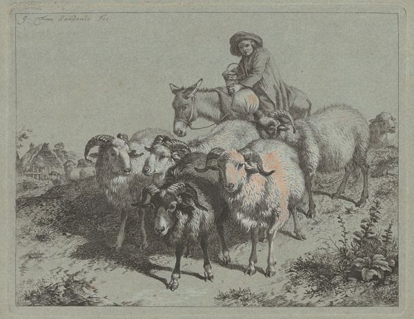 Curator: We are looking at "Illustration til Adam Oehlenschlägers digt \"De to kirketårne,\"" an etching by Lorenz Frølich made between 1840 and 1843. Editor: Immediately, I'm struck by the high contrast of this print. It evokes a sense of solitude against a wide-open, pastoral landscape. Curator: Precisely, the medium of etching, and in particular the detailed linework, are critical. Note the texture it provides, building up shadows and forms, creating depth despite the limited tonal range. We can discuss the use of crosshatching to build up areas of dark shading in the figures of the Knight and his steed, for instance. Editor: The equestrian figure looms large over the landscape, seeming to shepherd the sheep along the road to the church. He's certainly framed prominently within the composition. Is the figure meant to reflect some sort of idealized Danish identity in contrast to the two church towers shown at the end of his path, as a visual reference to the titular poem's themes? Curator: Very insightful. Frølich created this print as an illustration for a poem, as the title indicates. By the Romantic period, artists and poets looked towards their own histories for visual symbolism and mythic origins. The poem explores themes of national identity, loss, and the connection to the land. Editor: Interesting! The rider's silhouette is a strong compositional element but doesn't give away a lot about the individual's identity or expression. Yet the scale definitely imbues him with symbolic weight against the architecture of the church steeples on the horizon. It gives an implicit comparison in how their cultural and religious pillars may connect with each other. Curator: The two towers you mentioned stand, symbols that ground the narrative and create the intended resonance of historical consciousness the artist hoped to represent. I think he's carefully arranged these components, landscape and society together. Editor: It makes the image very effective. This reading certainly enriched my understanding of this work; thank you. Curator: A fine exercise, and my pleasure as well.