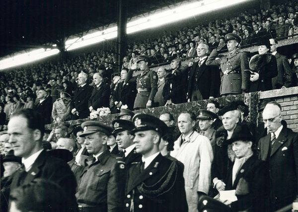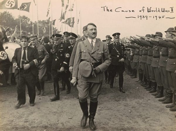 Curator: Immediately, I’m struck by the staging, the sea of swastika flags rippling in the background. It gives me the chills. Editor: This photograph, taken by Constance Stuart Larrabee circa 1935, captures a scene in Munich, Germany, during a politically charged time. While titled "Untitled (Munich, Germany)", its cultural impact is hard to ignore. Curator: Political is putting it mildly! It feels like a carefully constructed theater, doesn’t it? All those crisp uniforms, the way everyone's angled toward… him. And is that a photographer in the left corner? Meta. Editor: Indeed. The very act of photographing such events became a crucial component of Nazi propaganda. The image-making was very self-conscious. Think about how museums today grapple with presenting this period – do they normalize, contextualize, or resist such images? Curator: It's a tightrope walk, isn't it? I mean, aesthetically, there's a kind of dark, mesmerizing allure to the composition. The lines, the repetition… But then you remember what it represents, and it all turns toxic. It almost makes me question my immediate, gut response, you know? The human impulse toward order, even when it's deeply wrong. Editor: Precisely! This image operates on multiple levels. Larrabee, a South African photographer, captured something chilling here. How do we exhibit art responsibly that portrays painful, powerful, or traumatic events from history? It's never a neutral act. Curator: No, never. And the fact that it’s untitled adds another layer, doesn't it? It invites us to fill in the blanks, to project our own interpretations onto this incredibly fraught moment. I find it both powerful and deeply unsettling. Editor: An image to sit with, uncomfortably. It demands we reflect not only on the past but also on our present relationship with imagery, memory, and the forces that shape them.