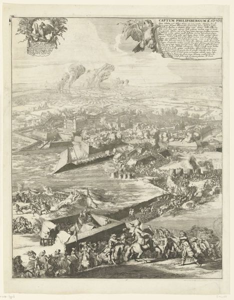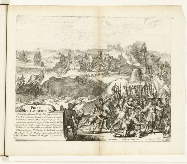 In this 1692 engraving by Romeyn de Hooghe, we witness the retreat of the Duke of Parma's army. The scene is meticulously rendered, a dense tapestry of lines creating a panoramic view, from the ships at the shore to the distant battlements on the horizon. De Hooghe masterfully uses perspective to structure the composition, dividing the image into distinct spatial layers. The foreground bustles with retreating soldiers, their forms tightly packed, creating a sense of urgency. The background, meticulously detailed, shows the vastness of the battlefield. The formal organization reflects the historical context of the Eighty Years' War. The linear precision and detailed rendering suggest a world defined by order and rationality, yet the chaotic scene hints at the limitations of such systems when confronted with the realities of conflict. The structure and the details, therefore, highlight the tension between control and chaos inherent in warfare.