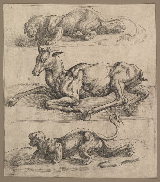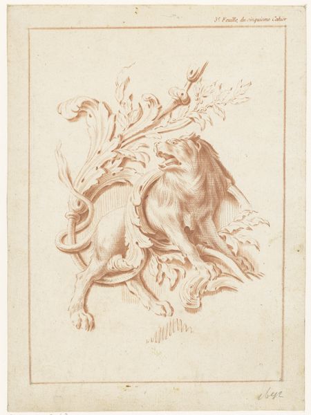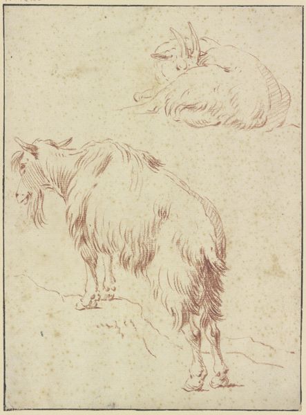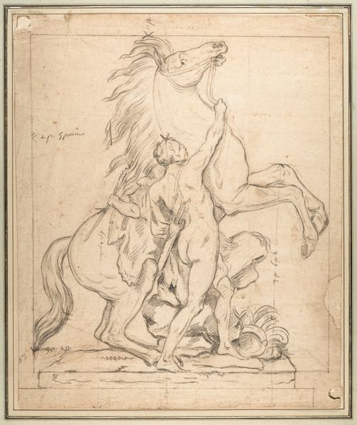 Charles Parrocel created this drawing, titled "Je zwei beisammen stehende Pferde," using red chalk. The composition immediately presents a study in form and function, showcasing two equestrian figures in varying poses. Note how Parrocel’s masterful use of line captures the horses' musculature and the textures of their saddles. The economy of line—the strategic thinning and thickening—suggests depth and volume, creating a tangible presence despite the sketch's inherent flatness. The horses’ stances, one upright and the other with lowered head, invite us to consider the dynamic relationship between stillness and movement. This drawing isn't merely representational; it's an exploration of structure. Each stroke contributes to a complex interplay of balance and tension. The red chalk, with its earthy tonality, further enriches the visual experience. It reminds us of the classical tradition while subtly pushing against its constraints through its fluid, expressive lines.
