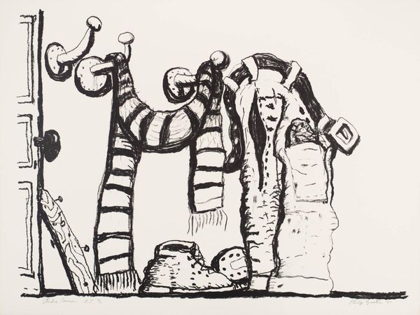 Curator: This is Philip Guston's lithograph, "Door," currently held in the Tate Collections. There's no specific date associated with its creation, but the imagery is quite evocative. Editor: The composition strikes me first—the stark blacks and whites, the oppressive sense of enclosure. It's strangely unsettling. Curator: Guston's work often grapples with themes of identity and anxiety, particularly during his later period. Consider the Klan-like figures he controversially introduced. Editor: Yes, and here, even without those specific figures, the abstracted forms retain that tension. Note the clustered, almost suffocating shapes. Curator: Exactly, the "door" could symbolize an entrance or exit, but also confinement. His work often reflects societal and personal struggles. Editor: True, and the lack of refined detail adds to the raw emotional impact. It feels immediate, almost confessional in its rough strokes. Curator: Guston challenges us to confront uncomfortable truths. His art demands we engage with these complexities. Editor: A powerful, if disquieting, work. It stays with you long after you’ve moved on.