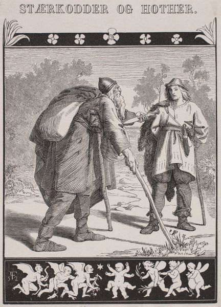 Curator: What strikes me immediately about this piece, it feels very earthy, and yet a bit mischievous, with all that cross-hatching adding texture. Editor: It's a drawing, an etching in fact, made by Francesco Londonio sometime between 1760 and 1764, titled 'Shepherd Speaking to a Peasant Woman'. It's a rather pastoral scene, isn't it? Curator: Yes, completely. You've got the peasant woman with a basket on her head, presumably filled with produce, and then that fellow lounging across a donkey… He looks more like he is gossiping than shepherding! It makes me think about Breugel; there is a groundedness here, too. Editor: He certainly has a smirk. Donkeys, of course, are ancient symbols, from burden-bearing to more satirical interpretations. This one seems rather comfortable in the tableau, wouldn't you say? And her basket… It’s such a commonplace object, raised to iconic status through the labor it represents. Curator: Oh, absolutely. Everything is wonderfully askew; look at the ladder propped against the stone building. Is it symbolic, pointing towards upward mobility, or something? Londonio's Baroque flourish is clear to see even in humble scenes, and the details draw me into it – I just get lost wondering about the scene itself, or trying to figure out what those two figures are chatting about. Editor: Perhaps he's telling her a joke? You can imagine he's offering to take the heavy basket, but judging by his posture, his actual plans probably involve loafing about! It taps into our ongoing cultural narratives – who does the work, who profits, and who gets to nap in the sun. There's the timeless tension and charm, all captured within a few etched lines. Curator: Exactly. And that’s what great art should do, capture those little everyday narratives. Makes you stop and think and imagine all in a heartbeat. Editor: Agreed, a glimpse into history that resonates still.