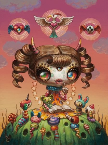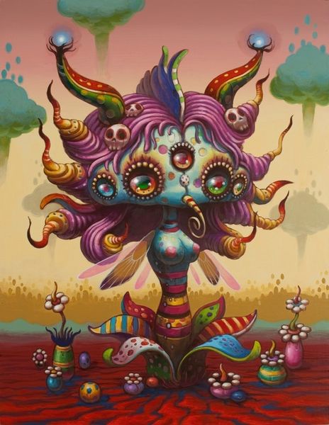 Yoko d'Holbachie’s ‘Venus’ reimagines Botticelli’s iconic goddess, through a lens that is both surreal and deeply personal. Born in 1971, d’Holbachie emerged as an artist whose work explores themes of sexuality, identity, and the subconscious, often challenging conventional representations of the female form. Here, Venus stands upon her shell, yet she is transformed: horns sprout from her head, and a third eye adorns her forehead, suggesting a being that transcends traditional beauty. The creature at her feet, with its single eye, hints at the artist's exploration of seeing and being seen, reflecting the complex gaze to which women are subjected. D’Holbachie blends the classical with the avant-garde, creating a Venus for a new millennium. The painting invites us to question how we perceive beauty and challenges us to embrace the unconventional and the multifaceted nature of identity.
