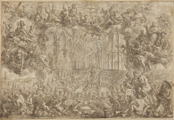 Curator: This drawing is "Paradise" by Federico Zuccaro, dating from about 1565 to 1577. It is currently located in the Metropolitan Museum of Art. Editor: My first impression is that it has a luminous, ethereal quality despite the earthy charcoal medium. The composition is fascinating; densely populated and yet it breathes. Curator: Indeed. The sheer quantity of figures hints at the artist's studio practice; probably executed in preparation for a larger commission or fresco, showcasing Zuccaro's organizational skills and mastery of pictorial space. It is a testament to the artistic labor involved in producing monumental artworks during the late Renaissance. Editor: The swirling composition draws the eye upwards. I'm particularly interested in how Zuccaro has arranged the figures. It seems less about individual likeness and more about a structural whole, a carefully considered distribution of light and dark masses that create a sense of otherworldly dynamism. The very conscious employment of quadratura hints towards High Renaissance ideals of harmony. Curator: Consider also the economic context. Zuccaro moved among courtly circles; designs such as this would circulate, signifying not just his artistic skill but his professional network. The materiality of the drawing itself—the relatively inexpensive charcoal—belies its function as a powerful tool in building his reputation. Editor: True. Though I remain most interested in the way that his figures and forms are constructed here, how he has structured space in an incredibly innovative way to express a divine and immaterial presence. There’s a certain drama enacted solely through line and tone. Curator: Looking at Zuccaro’s broader output and influence, one might wonder what the nature of artistic training was, especially apprenticeships during the time? How that social framework enabled such highly skilled craftsmanship to flourish? Editor: Regardless of context, it offers a transcendent vision. A structured, celestial order is being projected here, which resonates far beyond mere draughtsmanship. Curator: Ultimately, considering artistic production helps enrich my understanding of historical value systems. Editor: And, from a formal perspective, analyzing this drawing provides deep insight into the period's artistic sensibilities, doesn’t it?