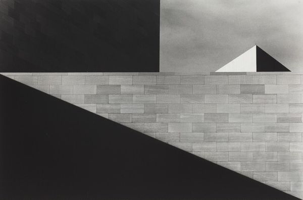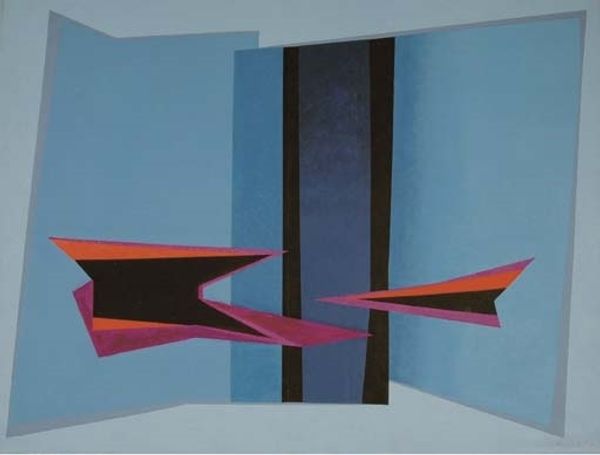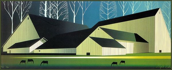 Curator: Winter Quiet by Eyvind Earle, dating to 1980. Immediately, the title gives us insight to the intention of this work. Editor: The title fits perfectly! I'm hit by this peculiar silence, a hushed stillness despite the graphic sharpness. It feels both inviting and unsettling, almost like a stage set. Curator: Precisely. Earle worked as a background artist for Disney, and his streamlined landscapes became emblematic of mid-century modernism. Look at how simplified the trees and house are, rendered with these elegant, hard-edged lines and blocks of color. His painting strips nature down to its essential forms, making an idyllic artifice. Editor: "Artifice" is a strong word. I like the composition's cool palette. The blues especially. Is this modernistic? Or a deeply personal observation of light and how it affects natural form? Snow always made the world geometric anyway, if we have the eyes to look, and maybe Earle gave himself over to the quiet. You can practically hear the snow crunch, and the roof creaks. Or am I just romanticizing? Curator: The question is whether Earle intended to depict reality or to fashion a very curated idea of it? His technique owes much to both traditional landscape painting and modernist reduction. It reflects a specific mid-century impulse to rebuild the world according to principles of order and clarity. What could be more idyllic than perfect silence? And idyllic silence can never really exist. Editor: That order feels fragile, though. As the silence of a snowfall is fragile. One crow, one footstep and it's gone. To make such quiet you need confidence. All the angles, geometry— it’s about simplifying down to the barest bones of winter, like stripping away everything unnecessary to expose a raw emotion, quiet the same kind as love or dread. You hold on. And, done! This has something haunting and unforgettable. Curator: Earle reminds us of art's capacity to reimagine the environment to conform to an era’s hopes and its aesthetic ideals, regardless of whether they can stand up to an existential investigation. Thanks for your poetic input. It is food for thought on an even colder day. Editor: You as well, friend. Now if you'll excuse me, I’m off to capture a little 'idillic silence' of my own before reality calls.