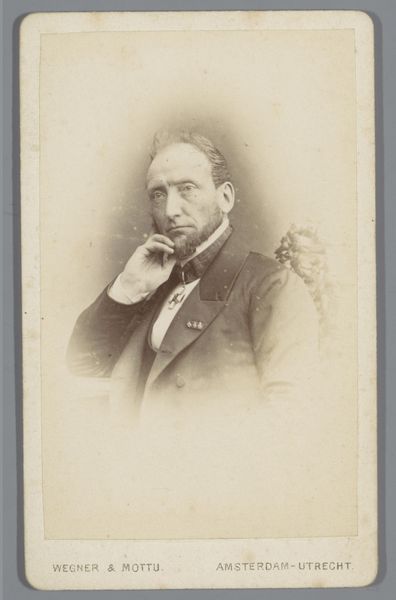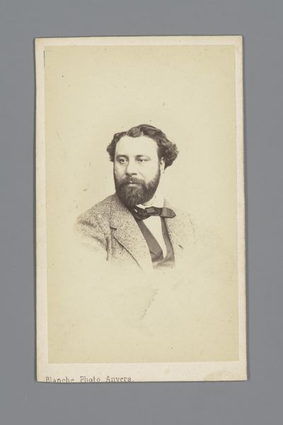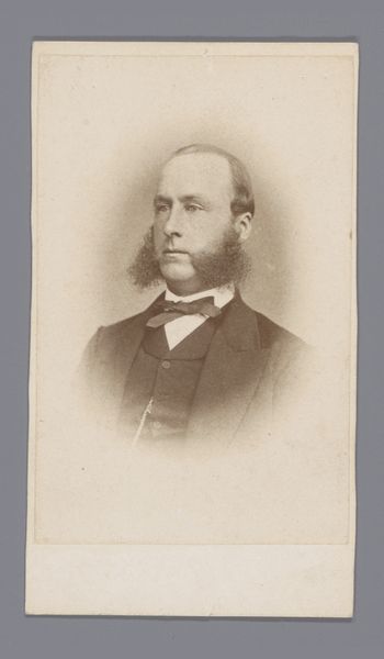 Editor: Here we have a photographic portrait from between 1859 and 1885, attributed to Ghémar Frères. It’s titled *Portret van een onbekende man met baard*, or *Portrait of an Unknown Man with a Beard*. He seems like a man of substance. What do you see when you look at him? Curator: Well, he certainly embodies the visual language of the era. Beards during this time became potent symbols, particularly for men asserting their masculinity and intellectual prowess in a rapidly changing world. Think of Darwin's beard, for instance. What do you make of his gaze? Editor: It’s very direct, almost confrontational. It makes me wonder about the relationship between the photographer and the sitter. Curator: Indeed. During this period, the rise of photography coincided with an increasing interest in physiognomy – the idea that one could discern character from facial features. Photography seemed to offer objective truth, yet it was still mediated through pose, lighting, and framing. His formal attire also speaks volumes about bourgeois respectability and self-presentation. Can we truly say what he *represents*, considering we don't know his identity? Editor: That’s true. His identity is unknown, yet the image conveys so much presumed information. I never thought about how much a beard could symbolize! Curator: Photography from this time also touches upon immortality through portraiture. It provides continuity, even though so much is lost. He might be unknown but now eternally seen, viewed. Editor: It's fascinating how one image can evoke so many cultural references. I see how symbols are inherited, how cultural information can be communicated. Curator: Absolutely. The photographic portrait becomes a mirror reflecting societal values and aspirations while preserving a trace of individual existence.