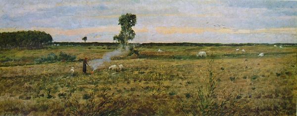 Editor: So, here we have Isaac Levitan's "A dull day. Stubble," painted in 1895 using oil paints. I find it kind of melancholic, don't you think? All those blues and browns...it feels like autumn sadness somehow. What do you see in this piece? Curator: Melancholy is a perfect word for it! It resonates with a deep, quiet observation of the Russian landscape. It’s more than just scenery, isn’t it? Look at the vast expanse of the field under that immense sky. There’s almost a… Yearning. Can you feel it? The vastness swallows everything, it could be anyone’s backyard, or maybe, no one’s at all. Editor: I get it. It's so open, it feels like anyone could just step into it. That horizon line almost feels like an invitation. Is that little figure in the field important? Curator: Ah, yes! That solitary figure becomes our anchor. We get this almost eerie, yet human element amidst the overwhelming landscape. Levitan was a master of subtly capturing the human relationship with nature – a beautiful solitude, not loneliness, mind you. Editor: I see what you mean. It is interesting to juxtapose that tiny, little figure with such massive, towering piles of harvested grain... that somehow brings a comforting feeling too, and maybe hope. It does tell me something new, like a story... of life... or love? Curator: Precisely! He is weaving this narrative. Think of it not just as a field, but a moment captured. A moment of labor, a moment of being, a moment of reflection under a sky heavy with its own unspoken story. A dull day can still be a profound day, couldn’t it? Editor: So, this painting really captures a fleeting but meaningful experience with nature... not just sadness after all. Curator: Indeed! It encourages us to pause, to breathe in the quiet vastness, and to discover the simple beauty of a seemingly ordinary day. It teaches us that, yes, love and beauty can be harvested from anywhere. Even perhaps on dull days, wouldn’t you say?