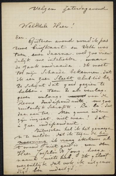 Curator: Here we have "Brief aan Jan Veth" or "Letter to Jan Veth", a pen and ink drawing on paper, possibly created between 1912 and 1918 by Willem Witsen. It resides at the Rijksmuseum. Editor: It looks very intimate, almost like catching a private thought. The casual script and the paper itself make it seem very immediate and unfiltered. It also seems that there are edits. Curator: Absolutely, and that immediacy is crucial. Witsen, known for his connections within Dutch artistic circles, wrote this personal letter in his characteristic hand. Considering the era, this level of correspondence highlights the network and material culture around artistic exchange. Editor: This is an unmediated form of dialogue between artists – think of the labor involved in manually writing this out. Do you get a sense, based on its materiality and tone, whether Witsen intended this letter only for Veth? Curator: Good point. The labor put into handwritten communication elevates the significance, yet its almost hasty style contrasts to traditional fine art presentation. Its placement at the Rijksmuseum allows a reflection on art history and artistic production during that time. Editor: It humanizes Witsen as more than an "artist genius." It invites us to consider their network. Jan Veth himself was very significant in the Dutch art scene and socialist politics! The exchange probably sheds light on both the men and the period. I wonder about access, and whether Veth’s labor and standing were equivalent to Witsen's. Curator: It emphasizes the value in art-making, the skill of handwriting, even amidst what feels casual. Appreciating the history and intent here opens discussion regarding cultural biases within art interpretations themselves. Editor: Thinking about the original historical placement helps. The letter humanizes the figures and suggests intersectionality, but access remains relevant as a core theme of consideration today.
