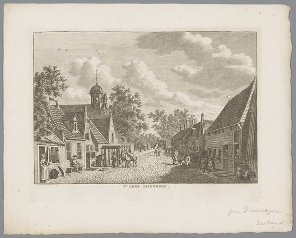 Editor: This is "View of the Hague or Watersloot Gate in Delft," made sometime between 1827 and 1895 by Gijsbertus Craeyvanger. It’s a print, an etching and engraving on paper. I'm immediately drawn to the way the artist has created depth using the light and shadow. What aspects of its composition do you find most compelling? Curator: The most striking formal element is the geometric organization of space. Notice how Craeyvanger uses the gate itself, and the road leading toward it, as orthogonals that converge on a vanishing point somewhere within the structure of the gate, drawing our eye into the pictorial space. What effect does this linear perspective have? Editor: It makes the city gate seem monumental, almost imposing, even though it's rendered with such fine detail. Is the somewhat limited tonal range significant here, considering that the printing methods of the time offered more possibilities? Curator: Precisely. Observe how the artist manipulates value—the gradations of light and dark—to delineate forms. The subtle transitions of tone create the illusion of atmosphere and surface texture. This restricted palette accentuates the forms without distractions. How do you feel about the somewhat high vantage point in this composition? Editor: It allows for a panoramic view, almost theatrical. And seeing the everyday life happening right there, outside the gate, gives the structure scale, placing everything into a certain order and context. The high vantage point allows you to understand this city and its space from within its limits. Curator: Exactly. It orchestrates space and the viewing experience, making us very conscious of looking as an activity. Editor: That's really fascinating; I hadn't considered the visual construction in such detail. Thank you!