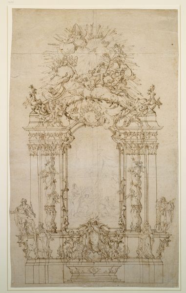 This is Johann Baptist Straub's sketch for an altar, rendered with delicate pen strokes on paper. The drawing presents a symmetrical and hierarchical composition, typical of Baroque designs. Two smooth columns frame the central space, crowned by God the Father amidst angels, while statues of archangels stand guard below. Straub uses the architectural structure of the altar to create a visual narrative, from the earthly realm at the base to the divine at the apex. The meticulous lines suggest not just form but also the texture and materiality of the intended sculpture, inviting a tactile imagining of the artwork. The sketch operates as a semiotic system where each figure and architectural element carries symbolic weight. Yet, it also reveals a tension between the solid, classical forms and the dynamic, swirling figures above. This interplay destabilizes any fixed interpretation, suggesting instead a dynamic site of visual and theological negotiation. It reminds us that the altar, even in its drawn form, functions as a structured space for contemplation, an invitation for ongoing interpretation.