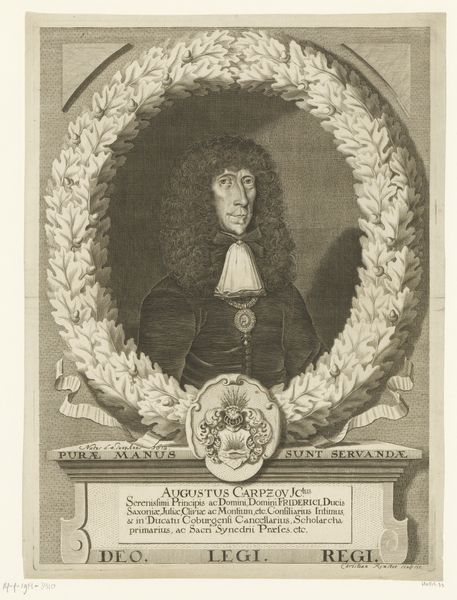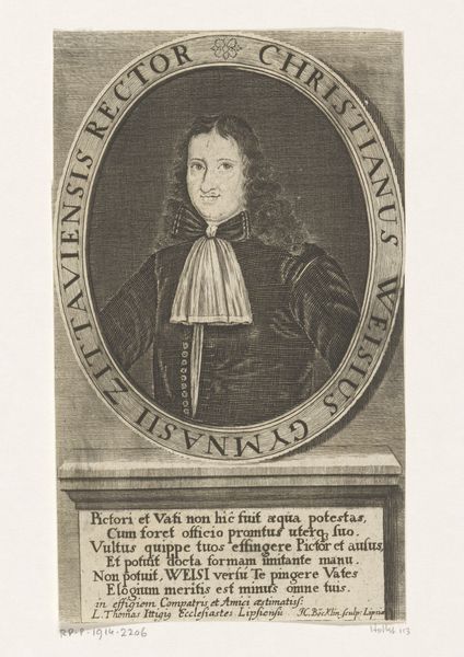 This engraving of Daniel Clasen was made by Christian Romstet, likely sometime around the late 17th or early 18th century. The image is made via the intaglio process, where lines are incised into a metal plate, which is then inked and pressed onto paper. Look closely, and you can see the network of fine lines that create the image. Romstet would have used specialized tools to carefully carve the image, building up tone and texture through varying line weights and densities. The choice of engraving speaks to the social context of the time. Printmaking allowed for the wider dissemination of images, making portraits like this accessible to a broader audience beyond the wealthy elite who could afford painted portraits. The precision and detail achievable through engraving also lent an air of authority and permanence, appropriate for a portrait of an academic. Engravings like this reflect a complex interplay between artistic skill, technical expertise, and the social function of images in early modern society.