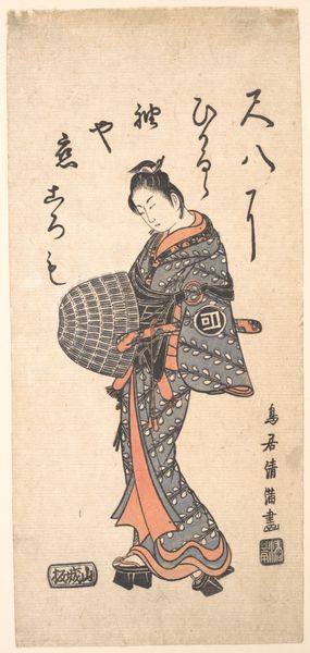 Curator: Ishikawa Toyonobu's woodblock print, "Segawa Kikunojō II," created around 1758, captures a noted actor of the era. The work belongs to the ukiyo-e tradition, reflecting a moment of popular culture from Edo period Japan. Editor: My first impression is the intricate layering; it’s amazing how the textile patterns jump out despite the relatively muted palette. The details feel painstakingly rendered. Curator: Absolutely. Toyonobu was working within the established conventions of ukiyo-e, catering to a burgeoning urban audience keen to celebrate stars of the kabuki theatre and the pleasure quarters. Prints like this allowed audiences to engage directly with their idols; it was an early form of celebrity endorsement. Editor: It is also interesting to consider the materiality of ukiyo-e prints themselves. Woodblock printing was a commercial enterprise. The collaboration between the artist, block cutter, and printer indicates division of labor in the making process, especially for this image being a portrait. Curator: Indeed, and let's not forget the role of the publisher, essentially the art dealer who financed and distributed these works. The economics of ukiyo-e are central to understanding its rise and popularity. These prints served as social currency in the demimonde of Edo. Editor: Looking closely, one appreciates the artist’s skill at conveying depth using line and color—and also, I’d argue, understanding the division of labour in its process and production! Curator: And think about the societal impact: prints like this fueled the fame of actors like Segawa Kikunojō II, solidifying their position within the cultural imagination. These prints become sites where social values and theatrical narratives intertwined. Editor: It makes you ponder on the contemporary echoes in mass-produced celebrity images, albeit transformed by modern methods. The consumption of imagery—still such a vital social practice. Curator: It has indeed made me think again about the commodification of celebrity and how little the fundamentals of that exchange have shifted over centuries. Editor: I leave reflecting upon those uncredited hands in this beautiful printmaking production who made such detailed patterns to capture an exquisite presence.