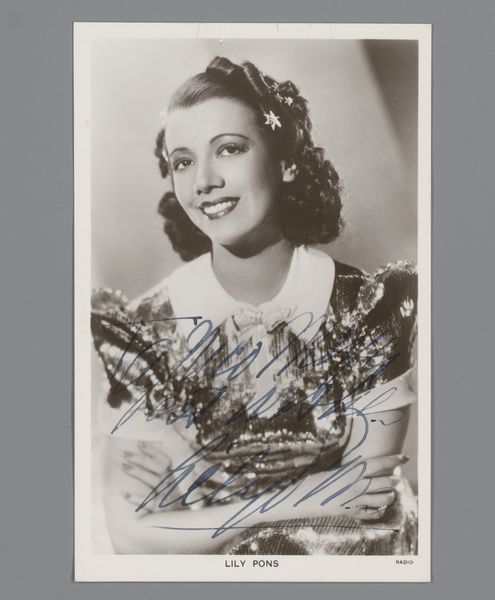 Curator: Keystone Press Agency may have captured this image of Nadia Grey around 1949 using a gelatin silver print. My immediate response is that this portrait bursts with personality and texture. Editor: Absolutely! You can almost feel the velvet of her robe, see the individual hairs of the feather hat and powder puff. The materials really define the image. Curator: I see her almost as a challenge to conventional postwar feminine ideals, what with that assertive gaze and somewhat sly smile, like she's about to make a joke. And considering that hat, there is an interesting tension created, navigating her identity. Editor: You know, the placement is interesting too. It draws your eye down her pearl necklace, across her furry stole. It’s clearly posed, not just to highlight her beauty but also these garments. How they might be perceived socially? The production, the work and cost put into each of these things is obvious. Curator: The setting—the dressing room context—provides so much additional richness. It frames Nadia in an explicitly performative space, highlighting not just her personal style but her crafted persona and identity. We see the objects of artifice. Editor: I am really thinking about the labour behind all those details too. All the hands that touched the fabric of that dressing gown, the feathers. And then, finally, this gelatin print we're looking at, a chemical process rendering a portrait available for consumption, as a commodity. Curator: Right. I think acknowledging the layers is important for grappling with the multifaceted narrative the image offers us, allowing for readings related to the gendered performance of glamour. Editor: The final product can obscure what goes into creating it. Photography itself transforms physical objects and actions into information—light sensitive processes render it permanent, tangible. Curator: Thinking about all the labour and intention interwoven into the photo makes the work, at once more complicated, but more meaningful. Editor: For me, it's that balance of presentation and the undergirding material reality that keeps me engaged with "Portret van Nadia Grey".