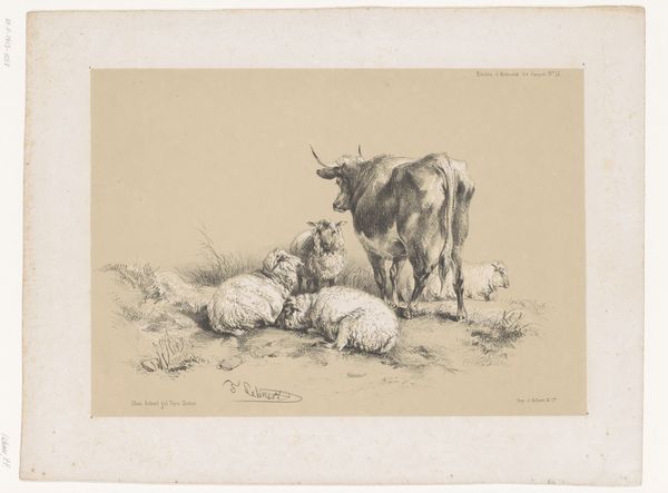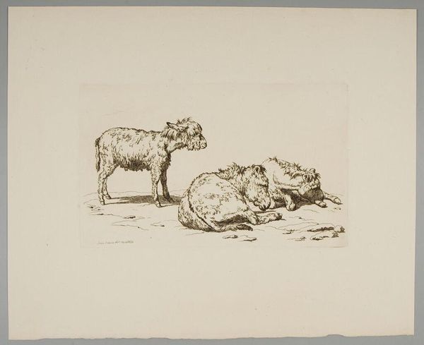 Curator: I am struck by the gentle serenity in this composition. A small flock of sheep rests in a pasture, rendered in fine lines of etching. Editor: Indeed. The print, known as "Får og lam," was created by A.P. Madsen in 1855. The artwork can be found at the SMK, or Statens Museum for Kunst. The level of detail Madsen achieved in capturing the sheep’s wool is quite impressive for an etching. Curator: The setting speaks to a wider conversation around the artistic expression of pastoral life during the 19th century. We see this subject appear frequently during this period. What symbols can we draw from the scene before us? Editor: Well, sheep, throughout art history, often symbolize innocence, gentleness, and community. The mother sheep and lambs certainly convey these ideas. This idyllic portrayal omits any hardship or challenges of agrarian existence, highlighting a romantic vision, perhaps? Curator: Precisely. I would argue that such images offered a form of reassurance in an era marked by rapid industrialization and social change. A scene that, even now, appeals as pure escapism. I find myself wondering about its contemporary audience and what messages about class it held then. Editor: That's interesting! I hadn't considered that aspect, but you're right. There is no shepherd or farmer visible. Are these sheep a signifier of Denmark's pastoral ideals, then? It reminds me of some biblical connotations, particularly a protective, maternal energy in the cluster of animals resting near the flowers. Curator: Yes, indeed! It would be productive to view it as an intersection of various visual ideas prevalent at the time, particularly within the wider artistic movement of realism. Editor: Madsen's etching does this beautifully—it captures the aesthetic essence of that time period through the simple imagery. Viewing artwork in collections provides this connection between artist and the societal undercurrent that affected and informed the work. Thank you, Madsen, for leaving behind the vision for future generations to enjoy.