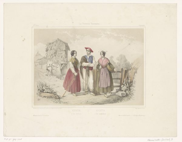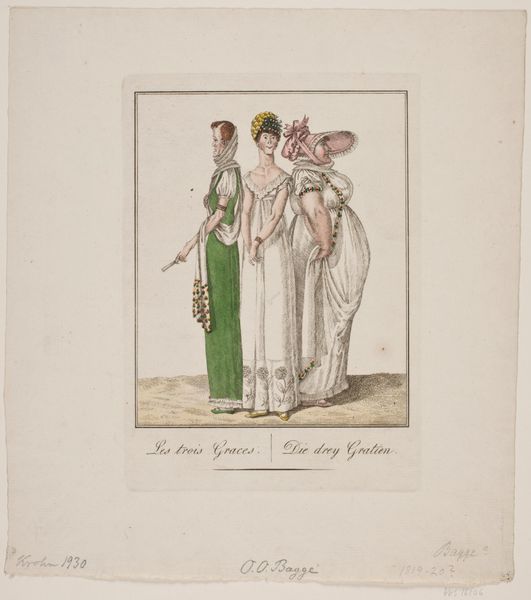 Editor: This is Jacques Etienne Victor Arago’s, “Dame wijst een huwelijksaanzoek af,” made between 1818 and 1827. It's a watercolor drawing and print currently housed at the Rijksmuseum. The figures and composition look like something out of a play. I am curious how to interpret this genre scene. What compositional elements stand out to you? Curator: Consider the formal aspects first. Note how the artist employs a stark, almost theatrical lighting. It flattens the forms, focusing attention on the details of costume and physiognomy. The limited color palette also reinforces a sense of the artificial. How does this contribute to the overall meaning? Editor: Well, the limited color palette along with sharp lighting does create a somewhat critical atmosphere. Are we meant to find these characters agreeable? Curator: Precisely. Look closely at the lines – are they fluid and graceful or harsh and caricatured? Consider also the spatial arrangement: the figures are positioned on a shallow plane, almost like actors on a stage. Editor: The lines defining their features are quite sharp, especially around the face of the gentleman making the proposal. And the cramped staging definitely gives it a performative feeling. It feels like the artist is making some larger comment on social roles and expectations, or perhaps the construction of identity. Curator: Yes, through an astute manipulation of line, form and color the artist crafts a sardonic commentary. Reflect on how such formal strategies enable the work to critique its subject matter effectively. The work uses caricature to scrutinize societal values of that time, which, for us, complicates our understanding. Editor: Thank you, looking at the aesthetic qualities in such a targeted way reveals aspects I hadn't considered before. Curator: Indeed. By paying close attention to line, color, and form, we uncover how aesthetic qualities contribute to its satirical effect.