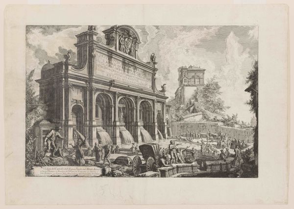 Giovanni Battista Piranesi created this etching, "Veduta degli avanzi del Foro di Nerva, l'arcade et la muraille," capturing the ruins of what was erroneously known as the Forum of Nerva. The composition is dominated by the imposing scale and stark linearity of the ancient stone structures. The artist employs a dramatic contrast between light and shadow, achieved through meticulous cross-hatching, lending a theatrical gravitas to the scene. Piranesi's method offers more than simple architectural documentation; he engages in a semiotic dialogue between antiquity and his contemporary world. The ruins, with their geometrical precision, signify the loss of the classical era's order and reason. This fragmentation of form reflects broader philosophical ideas of the sublime, where awe and terror intersect. The structure almost overwhelms the human figures, emphasizing the transience of human endeavors against the backdrop of history. The etching's formal qualities evoke a sense of melancholy, inviting viewers to reflect on the passage of time and the inevitable decay of even the most enduring human achievements. In this way, Piranesi uses the architectural form as a stage to challenge fixed notions of history and memory.
