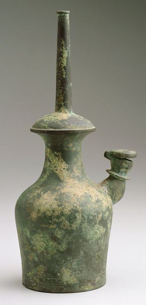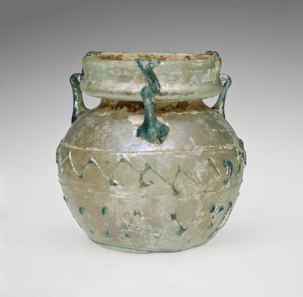 Curator: This object, "Sprinkler or Dropper Bottle," dates back to approximately the 3rd to 4th century. It is believed to be of Ancient Levantine origin and is currently held here at The Art Institute of Chicago. Editor: It has a very fragile beauty. Seeing this piece I think of ephemerality – something both delicate and lasting through its material properties. Curator: Indeed. Consider its function beyond mere utility. Who owned it? What were their rituals surrounding scent, medicine, or perhaps even religious practices? The perfume or the potion contained would signify the access to class and wealth of ancient roman-near-east inhabitants Editor: Its fabrication must have been a complex, likely specialized, form of labor. We need to really delve into the techniques involved in manipulating glass during that era to fully appreciate the craftsman's hand. I imagine a workshop environment with highly specialized roles involved in its production. Curator: Precisely. The design integrates geometric motifs, aligning with certain trends characteristic of that period, also tying the object to the Islamic Art and trade routes circulating at the time. What stories of cultural exchange can we uncover within these patterns? Is there perhaps commentary that emerges, revealing some socio-economic aspects within the broader historical trajectory of those that utilized these objects? Editor: Beyond that, thinking about the trade in raw materials – the glass itself – that tells a complex story of resource extraction and economic exchange in the ancient world. Considering the conditions of the glass production itself can allow the viewers to have a deeper awareness of exploitation or early forms of labor conditions, if you will. Curator: Exactly! So many intersectional dimensions embedded within this artifact, far beyond it’s immediate materiality and production; it holds keys to unlock insights into power, social structures, and the intangible qualities of a society long past. Editor: Absolutely, reflecting on the tangible aspects is a very grounding moment to recontextualize its social reality! Thanks for taking us deeper, the next time I encounter ancient glassware, I'll certainly see more than just a delicate piece of history.