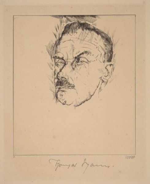 Curator: Edvard Munch's portrait, "Thorwald Stang I," a lithograph held at Harvard, presents a compelling study in contrasts. The stark lines create an almost palpable tension. What's your immediate take? Editor: Unease. He looks trapped, doesn’t he? Like he's peering out from behind bars, or maybe just a very, very troubled mind. The raw quality really gets under your skin. Curator: Indeed. Munch's use of lithography here is fascinating. The density of the blacks and the deliberate scratching away at the stone contribute to that sense of unease you mentioned. It accentuates the planes of his face, imbuing it with a structural severity. Editor: It's almost confrontational, that stare. But vulnerable too. Like he's daring you to look away, while simultaneously begging you to understand. Curator: The interplay between vulnerability and defiance certainly underscores Munch’s broader exploration of human psychology. Editor: You know, looking at it again, there’s a strange beauty in that raw honesty. Curator: Precisely, it's a beauty born of truth.