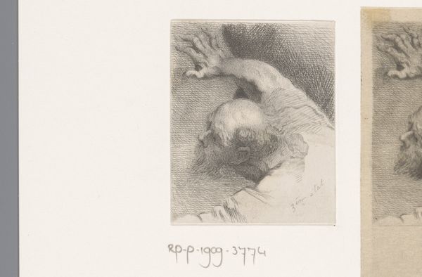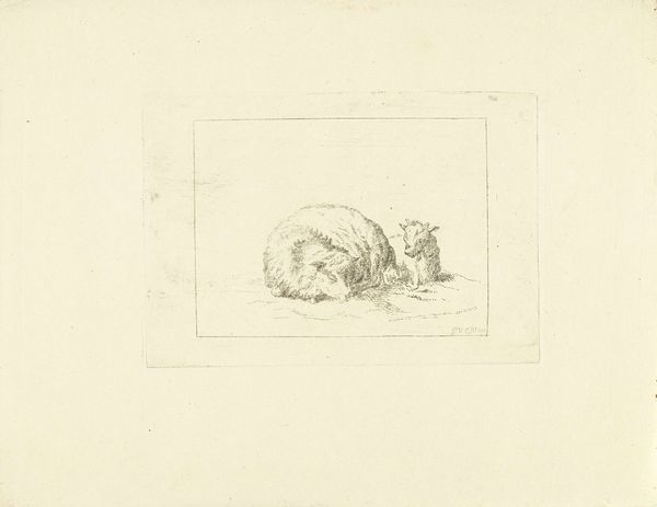 Editor: We're looking at "Sleaping puppy," an etching done around 1640 by an anonymous artist, here at the Rijksmuseum. There's something so tender about the way the dog is curled up; you can almost feel how soft its fur is. What do you see in this image? Curator: It speaks volumes through simple lines. Dogs in art often represent fidelity and vigilance. However, here, asleep, it perhaps signifies domesticated comfort, a gentle departure from the wild, hinting at a negotiated peace within our shared spaces. Look at how the darkness cocoons the animal – what does that evoke in you? Editor: A sense of safety and vulnerability at the same time. Like it’s trusting its environment completely. But how does the medium influence the message? An etching feels so... deliberate. Curator: Precisely. The act of engraving requires contemplation. It’s not a fleeting sketch but a considered translation of form and emotion. Each etched line holds the weight of that decision, lending gravitas even to such a humble subject. Does it make you consider our relationship to animals differently? Editor: I hadn't thought about it that way. I was just seeing a cute dog, but now I see it reflecting our shared history, dependence, and care. Curator: And in that reflection, perhaps we glimpse something essential about ourselves. The ability to find peace and rest alongside another species, immortalized through deliberate artistry. Editor: Absolutely. It’s much more than just a sleeping puppy, isn’t it? Thank you. Curator: My pleasure. Art reveals when we ask the right questions.