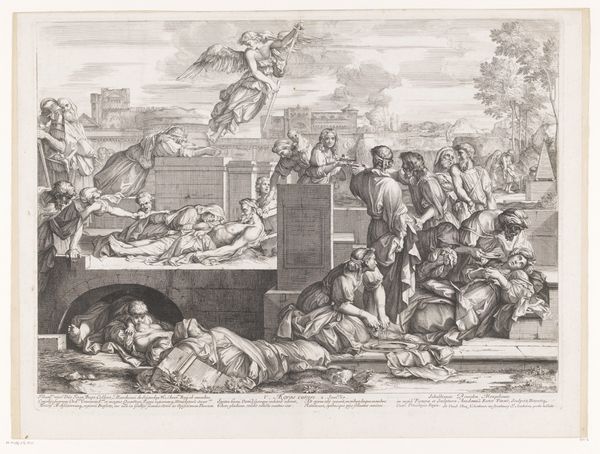 Curator: This engraving is called "Laven van de dorstigen," attributed to Sebastien Bourdon and possibly dating from 1626 to 1671. It’s currently held in the Rijksmuseum. The rendering, executed through engraving, captures an intensely dramatic and rather bleak scene. Editor: Indeed. Immediately, I'm struck by the composition, the crowding, and how much emphasis is put on this sort of rough-hewn materiality: jugs, rocky surfaces, course fabrics. The tonal range is amazing given the print medium. Curator: Bourdon uses dense hatching to create shadow and volume, notice how this gives depth to the forms, from the figures clustered around the well to the background architecture, establishing a clear hierarchy through sharp light contrast. Editor: The making of it is central to its meaning. This would have required physical labor and specialized skills – the engraver as a mediator, painstakingly translating an original design. What sort of economic models of production does this engraving participate in? Are we able to learn more about the labour process behind Bourdon's prints? Curator: These visual cues serve to emphasize the historical gravity embedded within the print. Note the classically inspired architectural structure situated in the background, and the Roman-attired figures at the scene’s upper left. Semiotically, how does that juxtaposition speak to a narrative tradition, echoing historical painting conventions in print form? Editor: Precisely. How much did the cost to produce influence the subject matter chosen, the audience targeted, or distribution of the images themselves? Let's think, also, about the act of collecting water here. Its materiality speaks of fundamental human needs, scarcity and communal resources, wouldn’t you say? Curator: Definitely. And considered formally, this reinforces the work's focus on thirst and salvation. The spatial composition channels our gaze directly toward the act of quenching thirst. From this perspectival vantage point, we see it all—a singular moment lifted from the story and presented for observation. Editor: Absolutely. Considering Bourdon’s print beyond its visual properties makes the engraving more vibrant, less static. This act reveals something beyond form—its grounding in real, material circumstances. Curator: In sum, the careful arrangement of this composition and use of engraving highlights both historical consciousness, while echoing themes found throughout other painting. Editor: I completely agree! Seeing this artwork more closely allows us to understand more broadly the lives and hands that shaped them.