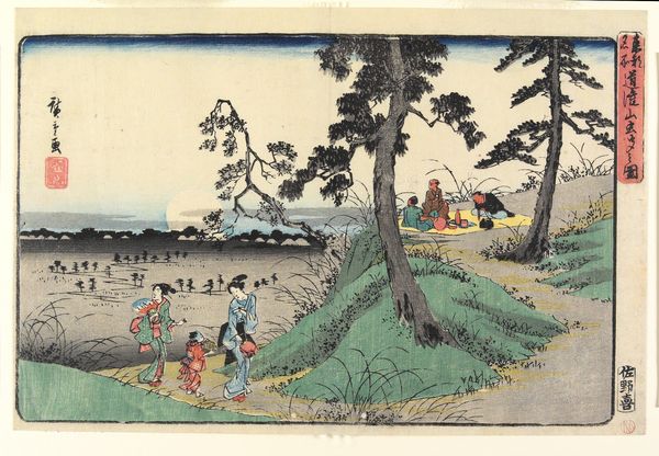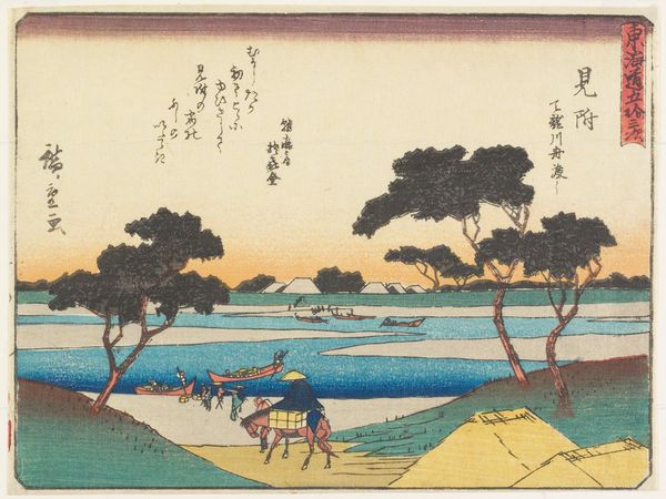 This woodblock print, made by Utagawa Hiroshige, captures a scene from Fukuroi, a stop on the Tokaido road. Observe the prominent pine trees that frame the composition. In Japanese art, pines are symbols of longevity and steadfastness. These trees are not merely decorative; they carry a cultural weight. Across cultures and throughout time, trees have signified life, growth, and connection. Consider the "tree of life" motif, appearing in ancient Assyrian carvings, or the sacred groves of classical antiquity. Here, the pine trees serve as silent witnesses to the human activity unfolding beneath them. They offer a visual anchor, linking the transient world of travelers to the enduring landscape. Consider how these symbols shape our subconscious understanding, invoking a shared sense of cultural memory. It is this resonance, this echo of past meanings, that gives the image its profound power.
