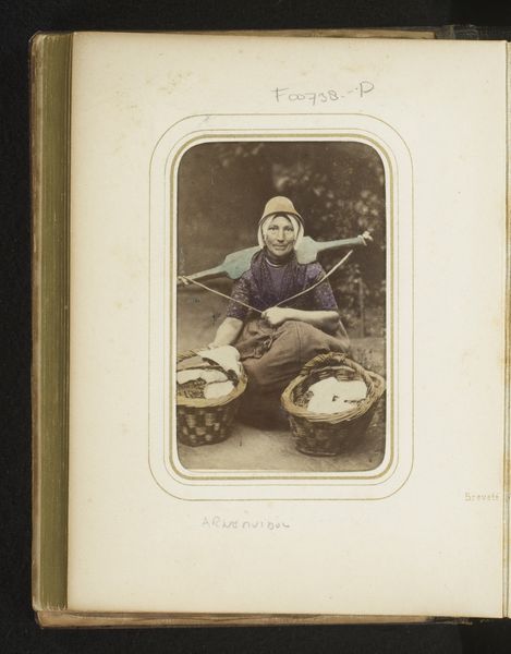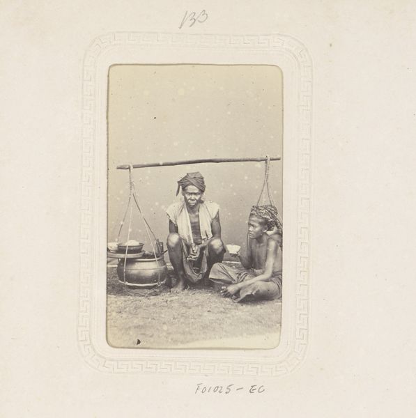 Editor: This is "Portret van een onbekende moeder en kind," or "Portrait of an unknown mother and child" by Famin et Cie, dating sometime between 1863 and 1889. It’s an albumen print photograph. The image feels staged but intimate, depicting a woman holding a child. I’m curious, what do you see when you look at this piece? Curator: I see a constructed image operating within a specific colonial gaze. These ethnographic portraits were often commissioned, shaping perceptions of non-Western cultures. Notice the woman's dress, the backdrop, the placement of everyday objects - a basket and bowl. Editor: So, you're suggesting that even what appears to be a simple portrait is loaded with political implications? Curator: Exactly. The photographer, likely a European, chose to represent this mother and child in a manner catering to European tastes and understandings. These photographs reinforced the Western ideas of the "exotic." Consider who was buying and consuming these images and their impact on policy and social structures. Were they simply personal keepsakes, or did they serve a broader, less benign purpose? Editor: It's easy to overlook that layer of context. Are there visual cues within the photograph itself that hint at this agenda? Curator: The framing itself – the oval format suggests a romanticized, perhaps idealized, depiction. But is it the sitter’s ideal, or that of the photographer and his audience? We should question how authenticity and representation operate in this setting. It prompts reflection on ethical representation within art, particularly across cultural lines. Editor: This image definitely holds more than I initially realized! Curator: Absolutely, the intersection of art and its historical context always reveals intricate complexities.