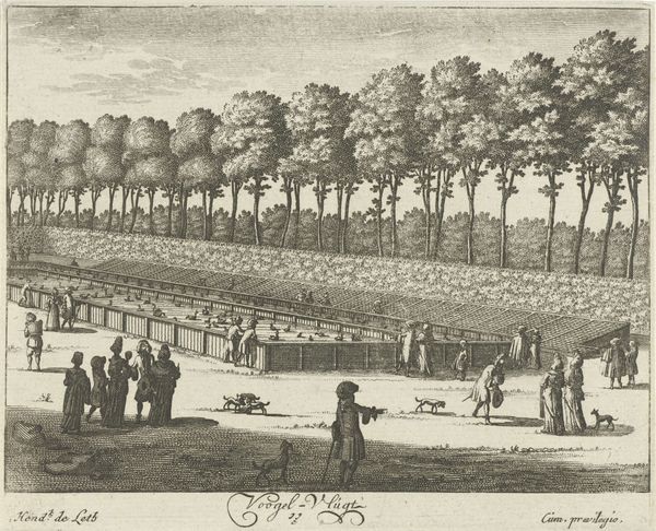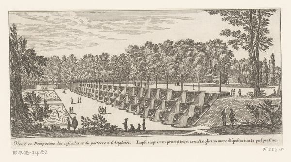 Editor: So, this is "Gezicht op de cascades van Rochefoucauld," an engraving made in 1652 by Israel Silvestre, currently residing at the Rijksmuseum. It feels so ordered and controlled, a far cry from what I usually expect from nature. What do you make of it? Curator: You know, that controlled feeling is precisely what fascinates me! Think of the 17th century—Europe was all about imposing order on the natural world, a statement of human dominance, perhaps? The very act of rendering such a scene as a meticulous engraving… isn’t that claiming a certain mastery? And the carefully placed figures? Do they enjoy nature or perform for it? Editor: Perform for it… that's interesting. I was just thinking how passive they seem. Curator: Precisely! They are part of the *display*. Notice how the linear precision emphasizes this. The rigid grid of the cascade is almost oppressive. It’s beautiful, yes, but almost… clinical. Editor: Clinical! That's a strong word. So, it's not just a pretty landscape; it’s a statement. Curator: Absolutely! A statement about power, control, and man's ambition to shape the world around him. Almost like sculpting water, a truly hubristic endeavour if you consider it. What does "landscape" even *mean* in such a context? Editor: Wow, I never thought of it like that. It makes you wonder what other hidden agendas might be lurking in seemingly simple landscapes. Curator: Exactly! It’s these layers that make art so endlessly fascinating, wouldn't you agree? Seeing the intentionality… Editor: For sure. This has given me a whole new perspective. I might just need to revisit some other landscapes now. Curator: Splendid. Keep exploring. The real masterpieces often lie beneath the surface of things, and of water in this instance, wouldn't you agree?