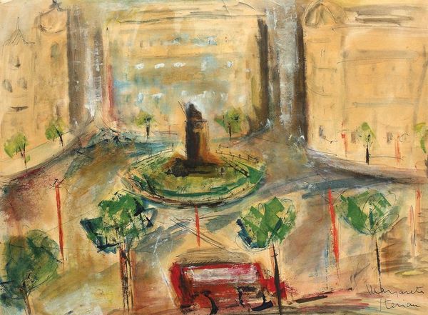 Curator: Ligia Macovei, a significant figure in Romanian modernism, painted "Landscape with Bridge" in 1940. This oil on canvas work presents a compelling scene filled with intriguing narratives. Editor: My first impression? It feels melancholic. The muted palette and the slightly obscured figures suggest a world caught between tranquility and unease. There's something about the solitary figure on the steps that feels quite poignant. Curator: Absolutely. Macovei painted this during a turbulent period in Romanian history, as World War II was intensifying, influencing art to subtly or overtly portray sociopolitical landscapes and gendered implications. The "bridge," a symbol typically associated with connection, here seems almost like a divider between the planes occupied by different members of society. Editor: Interesting that you say that because, while I agree that the bridge itself is evocative, bridges also are deeply psychological symbols. I see the architecture suggesting transition and access, particularly given the shadowy figure ascending, almost pulled towards some kind of resolution or understanding—the lights perhaps guiding one towards their journey to something different. Curator: That is insightful! Considering her feminist leanings, Macovei's construction could also depict the gendered constraints within public space at the time; perhaps these lights guiding the figure are guiding towards gender norms instead of self discovery. Notice how all the figures appear to be obscured in terms of features. We cannot deduce class or status based on visuals alone here, which points to the artist critiquing social constructs. Editor: True, yet that ambiguity, to me, emphasizes universality. Even in what could be assumed to be a portrait of oppression there is opportunity for any viewer to see themselves reflected in one or more characters. It could symbolize collective displacement or simply, human migration patterns in both a personal and cultural sense. Curator: These contrasting notions just highlight how deeply rooted and powerful images from the past can engage with current critical concerns, which are crucial to recognize. It speaks to how effectively her commentary of these concerns transcends decades, isn’t it. Editor: Indeed, it demonstrates the timelessness of these reflections within artistic expression, where imagery becomes its own complex language beyond mere representation.