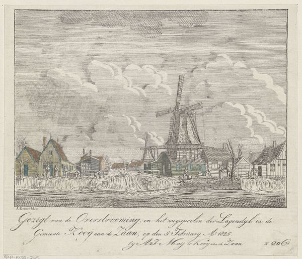 Albert Kramer made this print titled, *Watersnood in Koog aan de Zaan* around 1825. It was created using the traditional printmaking method of etching. This involves coating a metal plate with wax, scratching an image into it, and then immersing the plate in acid to create an impression. The linear quality and fine detail are a result of this meticulous, labor-intensive process. Notice how the varying densities of etched lines create tonal variation, delineating form and texture. These textures evoke a sense of atmosphere and depth, which are quite remarkable given the print's limited palette. The subject matter is a powerful reminder of the ever-present forces of nature and its impact on communities, particularly in low-lying regions like the Netherlands. As much as this image is about nature, it's equally about culture. The windmills – icons of Dutch ingenuity – here stand against the flood. The image is not only a document of a singular catastrophic event, but also an emblem of a community’s ongoing struggle to harness the power of the natural world.