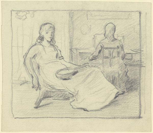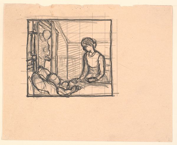 Curator: This pen and ink drawing is titled "Og da den gamle Mand rystede af kulde...", or "And then the old man shivered with cold..." by Fritz Syberg, created between 1901 and 1902. Editor: My first impression is one of intense domestic intimacy, even in this simple pen sketch. There’s something about the spareness of line and the fragility it conveys. Curator: Syberg created this poignant piece during a period when social realism was gaining momentum across Europe, offering a glimpse into the often-unseen realities of working-class lives. The title hints at vulnerability, connecting perhaps to the broader themes of poverty and aging that marked the era. Editor: Looking closely, the hatching and cross-hatching are not merely functional but contribute significantly to the drawing’s overall expressiveness. Notice how the lines cluster more densely around the figures to suggest depth and emotion. It also guides the eye from one element to another creating a visual pathway that reinforces the interconnectedness of figures within the space. Curator: That spatial interconnectedness is central to how I read the work. The image's themes of sickness, grief, and the impact on family is also clear. It implicitly critiques the socio-economic structures that left individuals so vulnerable, capturing a narrative about collective human resilience in the face of adversity. Editor: Yes, and if you analyze the grid marks beneath the illustration, we could posit these straight lines are being used to anchor Syberg's sketch – an effort, perhaps, to create some underlying sense of order amid the disquieting, turbulent content of the image. The grid adds an almost haunting structure to an image imbued with tension. Curator: Your analysis really underscores the depth within what might seem like a preliminary sketch. It encourages us to see beyond the aesthetic qualities and consider how Syberg subtly infuses societal critique into this very intimate domestic scene. Editor: Absolutely. Syberg manages to evoke such a potent and compelling emotive tension within this small drawing. Thank you.
