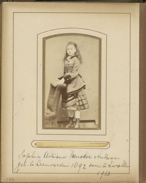 Editor: This is an albumen print titled "Portret van een meisje bij een kleed, aangeduid als dochtertje van Van Gogh," made around 1860 to 1870. It's an intimate, quiet image. What strikes me is the formality, and also how unsmiling the little girl is. What do you see in this piece? Curator: It's compelling, isn't it? The designation of the girl being possibly Van Gogh's daughter invites speculation, but it's the context of nineteenth-century photography that truly captivates. Studio portraiture was becoming increasingly accessible, yet remained a constructed experience, especially for women and girls. This image subtly reflects the power dynamics and societal expectations placed upon young females, wouldn't you agree? Editor: Yes, absolutely. The clothing and the staged setting contribute to that feeling. How does the photograph, as a medium, play into these ideas of societal expectation? Curator: Photography, then, wasn't just about capturing an image; it was about crafting an identity, reinforcing social norms. Consider the limited agency this child likely had in the creation of this image. Her stillness, her lack of a smile...it speaks volumes about the controlled presentation of girls and women during that period. The photograph becomes a tool for perpetuating certain ideals, freezing them in time. It makes me question who this was really 'for'. Editor: It's fascinating to consider how a single image can reflect so many layers of social history and gendered expectations. Curator: Precisely! Looking at this "daughter of Van Gogh" framed within these power structures gives her presence more meaning than a mere family snapshot. The piece can now serve as a conversation starter for an image, womanhood and privilege. Editor: I’m so glad we looked at it that way, thank you!
