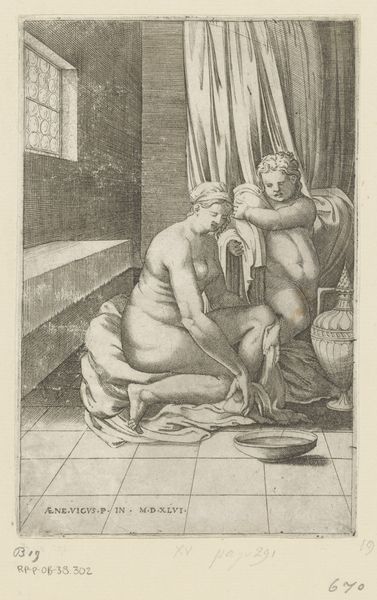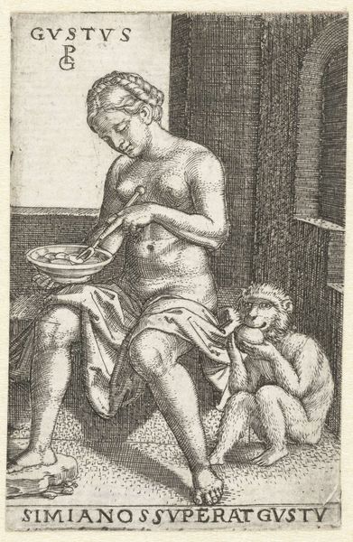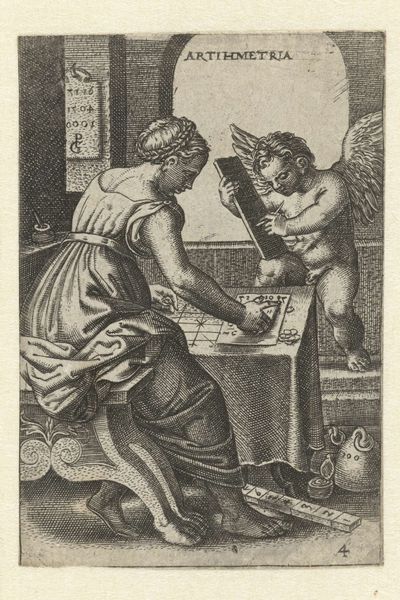 Georg Pencz created this engraving, Retorica, sometime between 1500 and 1550. The composition balances the static form of the seated Rhetoric against the dynamic posture of the cherubic figure holding a book. This tension gives the artwork a sense of restrained energy. The intricate network of etched lines, defining forms and creating subtle tonal variations, reinforces this dynamism. The image presents a complex semiotic interplay. Rhetoric, crowned with laurel, sits in a pose that suggests both authority and contemplation. The book-bearing cherub symbolizes the transmission of knowledge. Pencz uses these established visual codes to comment on the power and responsibility inherent in persuasive communication. He destabilizes a fixed meaning by adding a nuanced interpretation to the classical theme. Note how the formal elements—the contrasting textures, the balanced composition, and the symbolic figures—invite ongoing dialogue, suggesting that the essence of rhetoric lies not in static pronouncements but in continuous interpretation.