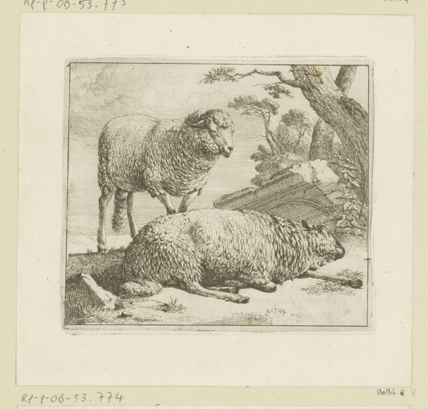 Johann Heinrich Roos created this etching of a standing ram and a lying sheep in the 17th century. Its rustic imagery reflects a growing interest in pastoral themes. The print presents an idealized scene of rural life, a common trope in Dutch Golden Age art that served to reinforce certain social values. The animals, symbols of docile labor and natural abundance, are set against the backdrop of a round tower, possibly alluding to themes of protection or the idyllic past. Prints like these were made for a growing art market outside of the church or aristocracy. These pieces circulated among a rising merchant class, helping to shape their understanding of the world and their place in it. The images, though seemingly simple, participated in constructing cultural identity and class aspirations. Further study of period literature and economic records could shed light on the networks through which such images circulated. It would help us understand how they functioned within the broader cultural and economic landscape of the time.