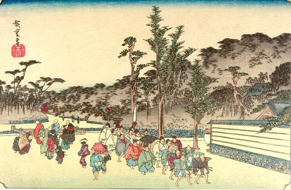 Editor: This is Utagawa Hiroshige's woodblock print from "The Fifty-Three Stations of the Tokaido." I'm struck by the contrast between the laborers and the more formally dressed figures. What can you tell me about this image? Curator: Notice how the printmaking process itself – the woodblock carving and the application of color – dictated the flatness and linearity of the figures. Hiroshige highlights the physical labor involved in transporting goods, contrasting the bare-chested porters with the more leisurely travelers. Editor: So, it's commenting on class and the realities of travel? Curator: Exactly. The print doesn't just depict a picturesque scene; it reveals the social and economic structures underpinning that journey, the very means of production required for travel and trade. It makes you think about who benefits and who labors. Editor: That’s a really interesting way to look at it, considering the actual labor involved in creating the artwork itself. I'll remember to consider all the workers involved next time.