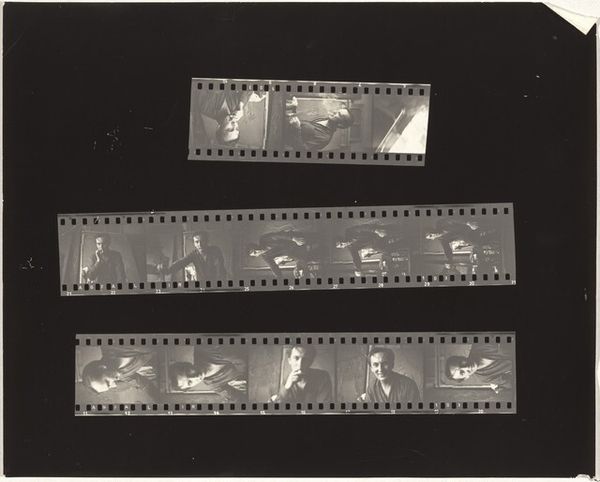 Curator: Let's turn our attention to Robert Frank's gelatin silver print, "Jack Kerouac and flamingos--Florida no number," created in 1958. The work features two strips of what seem to be the artist's film roll. Editor: It has a striking starkness. The contrast between the almost brutally dark background and the fragile strips creates immediate tension. There's an undeniable melancholy too, as if these are remnants or traces of something lost. Curator: Precisely. Consider the materiality of it. Frank's choice to display the photographic strips raw, unedited, calls attention to the process. The perforations, the frame numbers, they're all laid bare. There's a structural honesty. Editor: Yes, honesty, but consider what it conveys. Flamingoes are icons of the Florida landscape and also markers of a very brief era in Florida's popular culture, where cheap tourism offered fleeting visions of paradise. Displaying Jack Kerouac's traces alongside them brings together icons of counter-culture on a parallel journey towards obsolescence, the Beat generation, or Florida's false promise of sunny optimism. Curator: That relationship creates interesting pictorial contrast: One strip blurry and barely readable above and one repeating clearly legible flamingo scenes below. Are we seeing perhaps the struggle and fleeting nature of capturing experience versus something staged? The technical effect yields more than simply legibility. Editor: Maybe, or maybe there's a psychological landscape emerging; the top strip becomes something like memory--fleeting, elusive--while the flamingos are clear, like established narratives that risk oversimplifying complex places. It's an emblem of a deeper exploration. Frank seems to invite us to challenge those surface level images. Curator: An invitation encoded into the arrangement of forms and their inherent qualities. Fascinating how Frank distills cultural critique into a formal exercise. Editor: It is, ultimately, an exercise in cultural anthropology. We are compelled to examine both subject matter and cultural echoes, and to consider its historical relevance even now.