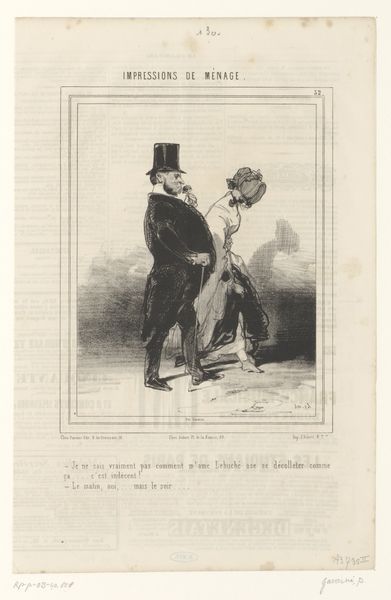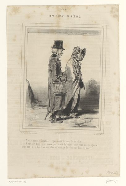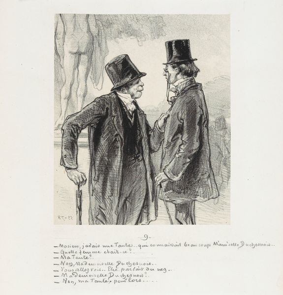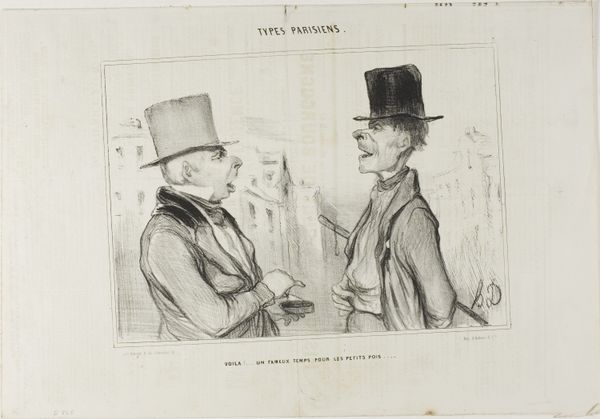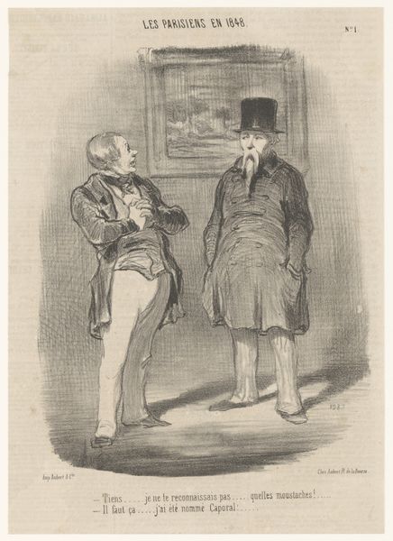 This print, "Oude man levert commentaar op de hoed van een schildersleerling," was created by Paul Gavarni. The composition is structured by the stark contrast between the older man's ornate attire on the left and the simpler, darker garments of the apprentice on the right. The lithographic lines define not just the figures but also the social commentary. Gavarni uses the detailed hatching to emphasize the older man’s elaborate beard and layered clothing, contrasting with the apprentice’s smooth, unadorned cloak. The hats are the focal point of the composition and the visual signifiers for the two figures' positions. The print destabilizes conventional portraiture by focusing on the dynamics of class and artistic training. The elder's critique of the apprentice's hat, a seemingly trivial detail, becomes a symbol for broader cultural and economic disparities, revealing how fashion and appearance are regulated by societal codes. The visual elements, therefore, function beyond aesthetics, engaging in a discourse about status and identity.