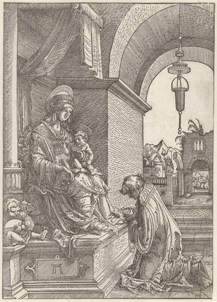 Leonhard Beck's woodcut, "Saint Verona," presents us with a study in contrasts, rendered in stark black lines against a pale ground. The composition centers on the saint's act of charity, set against an elaborate architectural backdrop that recedes into the distance. The linear quality of the woodcut emphasizes form, delineating the heavy folds of Saint Verona’s robes. A halo emanating light surrounds the crown on her head, which she is about to give away. This detailed focus shifts to the figure of a seated beggar in a tattered coat and head covering, his posture mirroring a state of receipt. The architectural elements, while providing context, also serve as a semiotic framework. The lines are not just descriptive, but structural; they define the narrative space and moral allegory. Beck uses line and form to explore themes of sacrifice, humility, and the role of the Church within the social fabric. The artist invites us to consider how symbolic structures reinforce or challenge existing social and religious meanings.