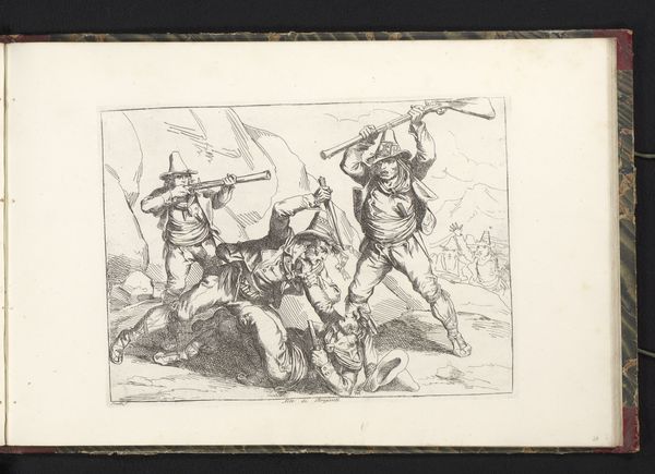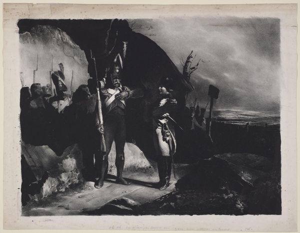 Jan van der Veen created this lithograph, "Witte van Haemstede plant de vlag op de Blinkert," sometime in the mid-19th century. The scene is dominated by a central figure planting a flag, flanked by supporting soldiers, all rendered in precise lines. The composition draws our eye upwards, following the flag and the raised sword, creating a sense of dynamic movement. A textured effect is achieved through closely placed hatching lines to create light and shadow, defining the forms of the figures and their armor. The lithograph's linear quality not only depicts a historical event but also communicates power and national pride. The arrangement of the figures and the meticulous detailing evoke a structured narrative. The choice of a black and white lithograph removes colour from our analysis, highlighting the structure and the way the shapes interact. The artist's careful arrangement and formal choices underscore a moment of triumph, inviting viewers to engage with ideas of heroism.